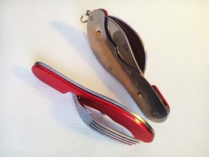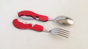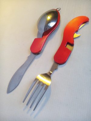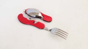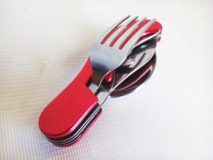 No posee piezas plásticas y se separa en dos para usar tenedor cuchillo.