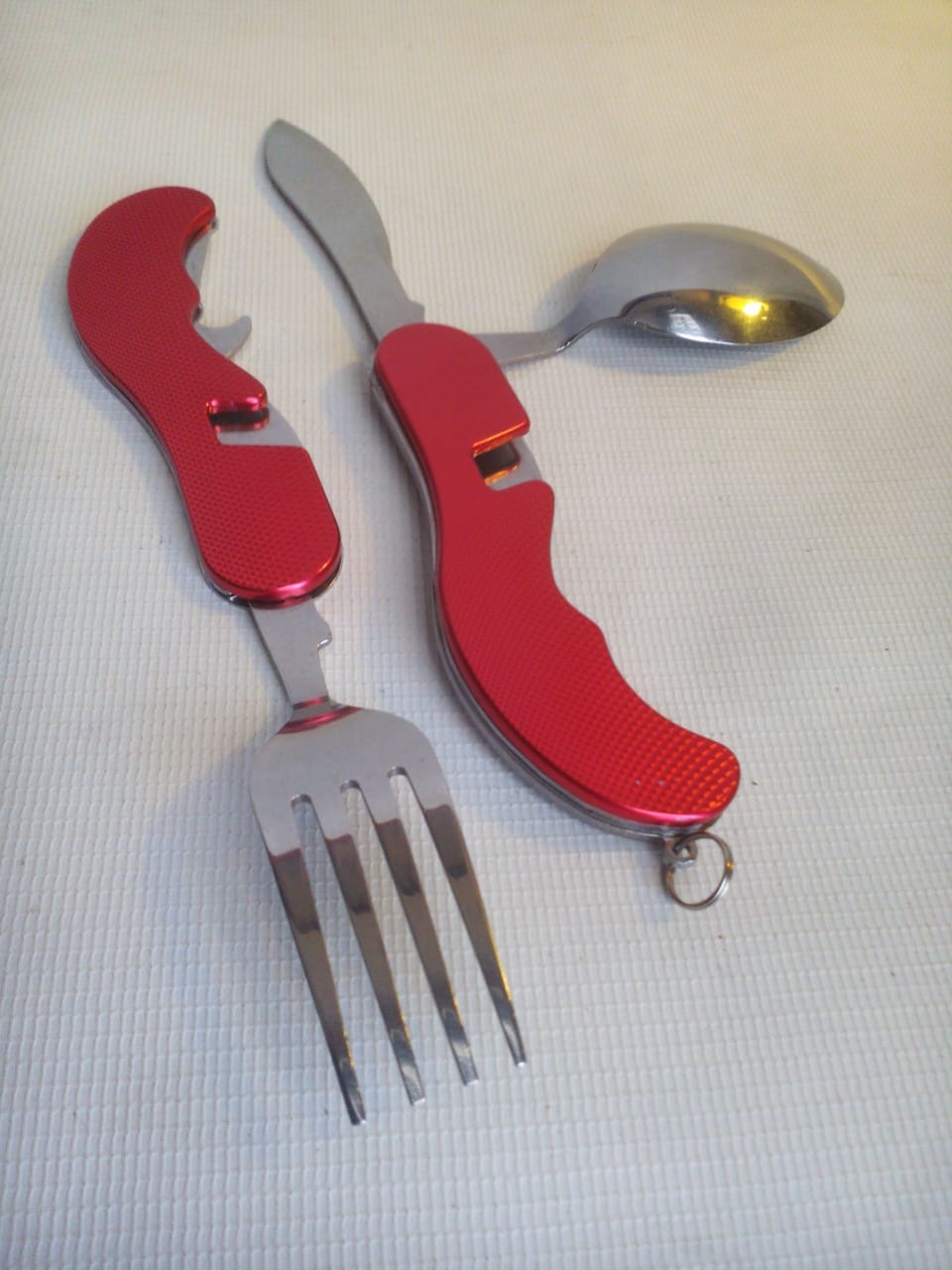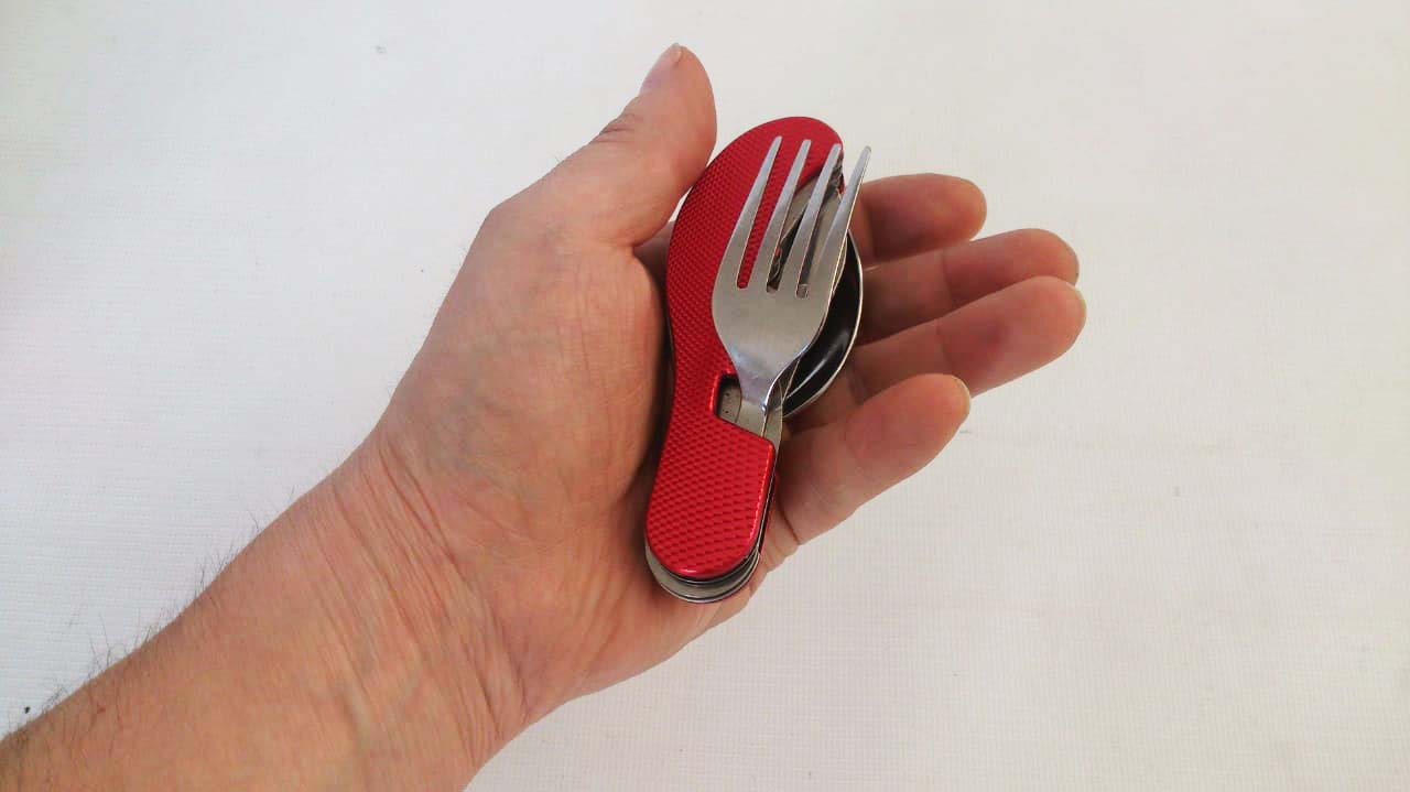 No posee piezas plásticas y se separa en dos para usar tenedor cuchillo.